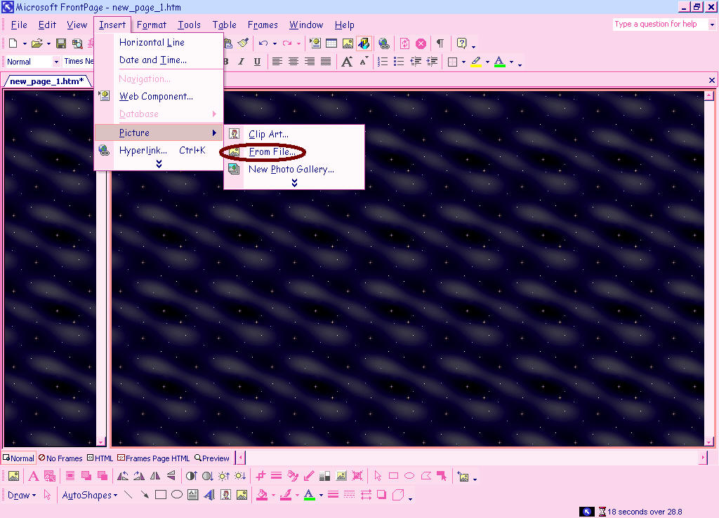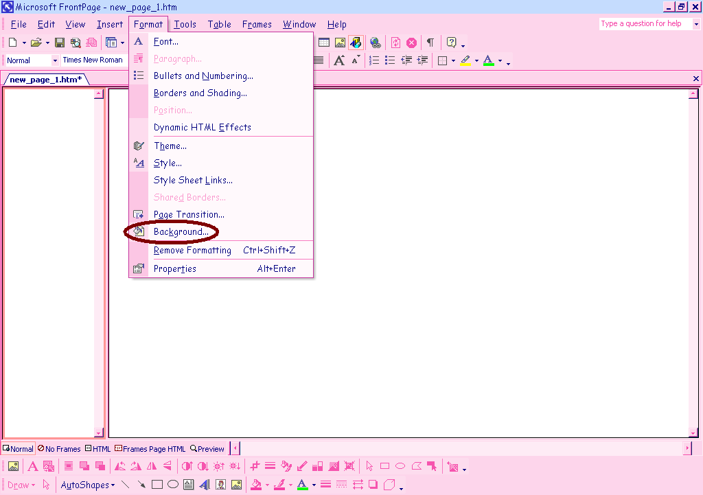 Now that you have made it this far I will go on to tell you how to insert a background. Make sure you click inside of the frame you wish to set the background for first (the cursor will flash). Now select format from the menu in the top of the screen. In this format menu click background.