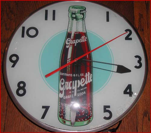 | Grapette Telechron clock, made in Ashland, Mass @ $511.01, but reserve not met | Smile ACL bottle @ $138.51 | Smile 18-inch display bottle @ $405.00 | NuGrape 36-inch sign @ $162.50 but reserve not met |