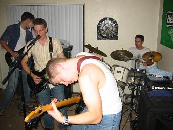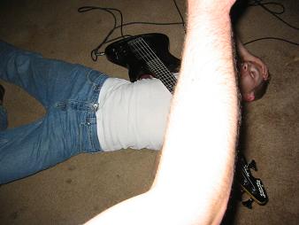 John is so wasted that he is about to keel over and take out Justin's mic stand.