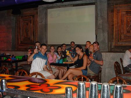 The group toasting their coladas while Justin (the only member of the group who doesn't drink) toasts his diet caffeine-free coke.