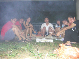 Went back to the apartment after capsizing to bathe. I was the last to bathe, and everyone else was down at the bbq area, setting it up. Only Tsing, Sueh & Kinz were left. Then while I was bathing, I heard Kinz go, "Bye waiee!" So I just said, "Bye!" Hahaha. I thought they wanted to scare me, but I thought I'd call suanli or sherhuey, so no big deal. But later I heard the main door open, so I thought someone came back to wait for me. Then when I finished bathing, I came out and the whole apartment was empty. So I was like thinking, "Eh, so weird wan." Then I saw the guy's room's door slightly ajar, and inside was really dark, and I dunno why but I just went to check it out. When I opened the door, I saw 3 stooges sitting on the bed going, "Woiiii... how you know we're here?" Lol! Looks like they (Tsing, Sueh & Kinz) didn't leave after all. Hehe.