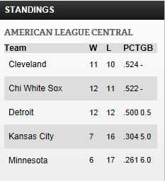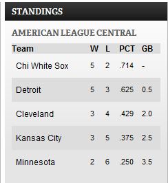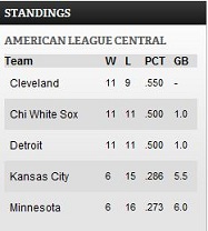 May 2, 2012....So Gordon Beckham's bat finally woke up last night as the Sox killed the Indians 2-7. Chris Sale pitched a pretty good game and lookie here, the Sox are tied for 1st: