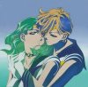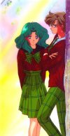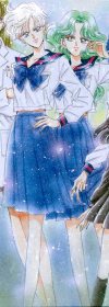 They metHaruka and Michiru are introduced by their friend, Elza Gray, after a track meet. Michiru, knowing Haruka is Uranus, speaks with her, and though Haruka realizes this, she remains uncooperative, refusing to accept her past and the duties that accompany them in the present. Michiru asks Haruka if the girl will pose for her pictures, but Haruka says she's uninterested and "passes". Later on, while on a cruise ship, they meet again. Michiru performs a violin solo on and which Haruka is a guest aboard. Haruka comes across a painting Michiru did called "The End of the World" on her way below deck. Michiru speaks to her there, telling Haruka that what the painting depicts is not from her imagination but a real warning of what the future will be if Haruka does not help her prevent it from occuring. Haruka refuses again to accept her past, telling Michiru to do it as she wants to focus on racing. Michiru angrily retorts that she too doesn't want her duties, as she wants to become a violinist. Therefore, as much as Michiru wants Haruka to accept her past and her mission to save the world, she herself is also partially torn by conflict. Upon learning about Haruka, she is immediately attracted to the girl, and she seems to have an understanding of the other that even Haruka doesn't have of herself. On the cruise ship, Michiru admits to Haruka that there is someone who in her school who wants to ride with Haruka in her car, (reffering to herself, showing her desire to be with Haruka). Because of this, um, LOVE attraction, when Haruka is attacked in a garage by a daimon, and her henshin stick (makeup wand) appears to save her, Michiru stops her from touching it, and warns her that if she picks it up, her life will never be the same again. Then she transforms into Sailor Neptune to attack the monster. As Neptune is about to finish it off, Haruka stops her, saying that the monster is actually a possessed boy. Neptune says that if she doesn't kill the monster, it will hurt other people in defence of her actions as Haruka angrily questions that belief. When the monster recovers, it goes for Haruka, but Neptune pushes Haruka away, getting hurt in the process. Neptune then uses Deep Submerge on the monster, and it turns back into the boy. As Haruka leans against the wall and examines her arm, perplexed by the senshi's actions as she could have badly injured herself and might have never played the violin again, Neptune admits her feelings. She tells her that she was happy that Haruka was her partner, and that she wants to ride with Haruka in her car. She then says sorry for telling Haruka her thoughts, because she didn't want to tell them to her. However, as a result of this, Haruka finally accepts her past and destiny to be Sailor Uranus. BwaUnlike the inners scouts, Haruka and Michiru don't appear NEARLY as much. First, they come off as evil scouts, then still stay to themselves. In the Sailormoon SuperS season, they only appear twice. I don't really get it. I don't know why the outer scouts don't seem to be as important, just because they didn't show up sooner. The outers are kind of an odd bunch anyway... |