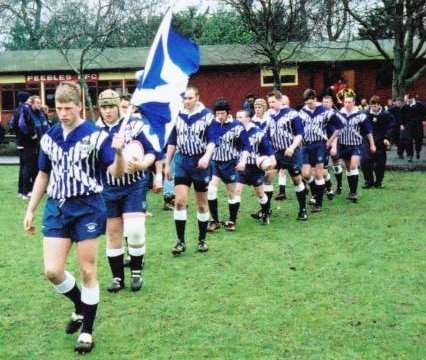 Scotland Captain, Mark Webster leads out the team. The Scotland team line up. The Teams await the National Anthems
