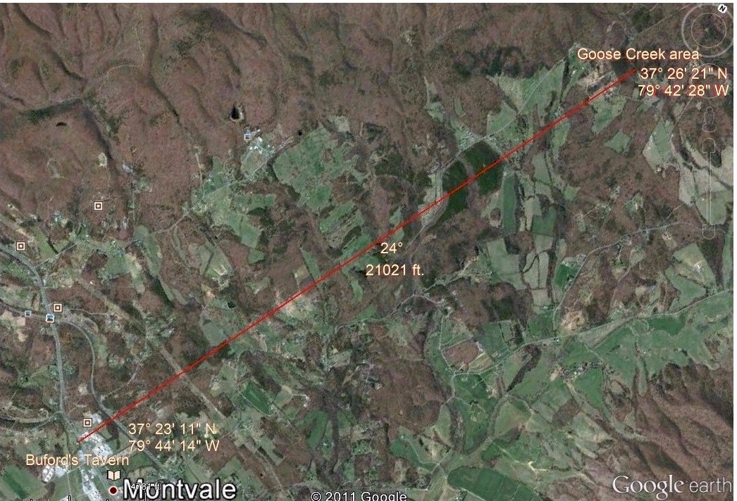 Add these numbers to find a total of 21021, which in feet, is 3.98125 miles, or "about four miles", a coincidence surely. We then draw a circle centred on Buford's tavern with a radius of 21021 feet.
