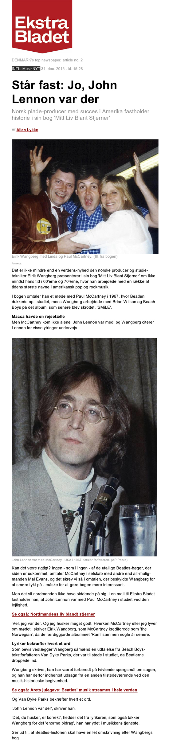 The first article is calling me a liar by stating that John Lennon did not As stated in my book, My life among stars, and with proof in hand - the newspaper released a second article right away, apologizing and calling my