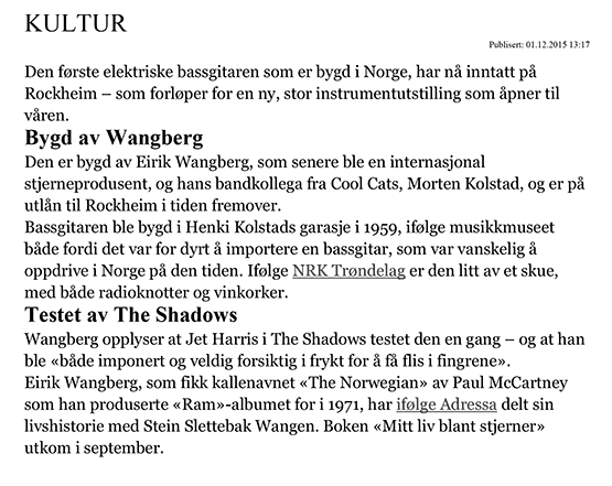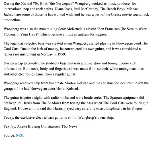 In the Kjetil Storvik book Stumbling Guitars - From Nilsen guitar to Fender Stratocaster (2003), it emerges that Wangberg built the bass out of necessity. Wangberg was in the late '50s leader of a youth club at Ullern in Oslo and engaged the band Jan Rohde and his Cool Cats. During a serious talk about international efforts for the band, there was a need for a bass guitarist and thus a bass guitar. Wangberg was appointed, but the bass was a little-known concept in Norway. To import a bass guitar from abroad was out of financial reach. Wangberg, therefore, went to an assorted music shop in Sweden, took strategic measurements of a bass guitar and bought strings, stool, and other technical necessities. Wangberg designed the instrument, and he and bandmate Morten Kolstad made the body, neck and fingerboard from scratch (in a garage belonging to famous actor Henki Kolstad). They mounted tuning pegs and a pickup taken from a guitar, along with a radio knob and corks. Almost before the glue was dry, Wangberg and his bass got their stage debut at a Tivoli carnival by East Railway Station in Oslo. The performance became a great success, but also resulted in open wounds from the protruding frets. Wangberg - which we now know is a master when it comes to sound - as such producer for Paul McCartney, Beach Boys, etc. - also took the bass with him to England, where The Cool Cats met The Shadows. In Kjetil Storvik book, Wangberg says that Jet Harris of Shadows was impressed by the bass and tested it out. But he was very cautious, for fear of getting finger wounds from the metal fret edges! |