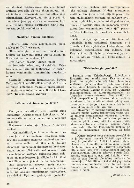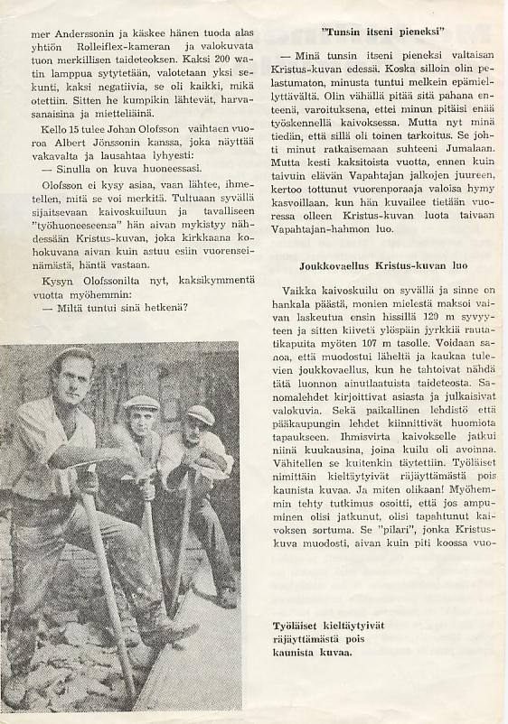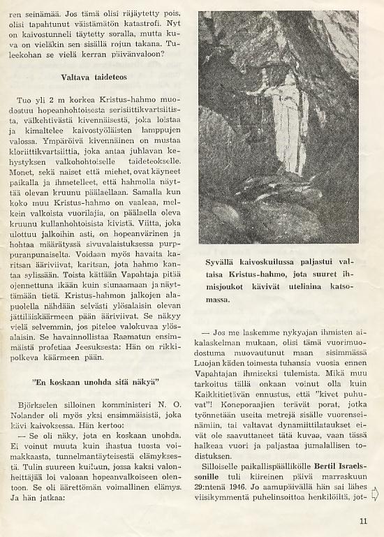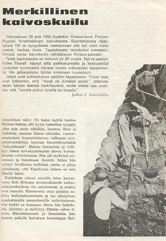 Asiasta keskusteltiin hyvin paljon vuonna 1946.Kerrottiin,että jotkut kaivosmiehet olivat kieltäytyneet räjäyttämästä kalliota.Mutta kuilu piti puhdistaa,ja uusissa räjäytyksissä hävisi harvinainen muodostelma.Tähän ratkaisuun johti myös se,että ennen kuulumaton ihmisvirta teki työskentelyn kaivoksessa vaikeaksi." Lähetys-viesti Joulu 1969 Kristinebergin profetia: "Samalla