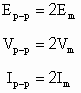 電動勢、電壓和電流的峯至峯值分別用 Ep - p 、Vp - p 和 Ip - p 來表示。在數值上,正弦交流電的峯至峯值等於峯值的兩倍。