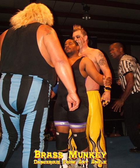 Brass Munkey is attacked by both Marcellus King & Ric Converse; suplexes Converse; then has his hand raised by referee Redd Jones after pinning Converse to win the 2008 Johnny Weaver Memorial Tournament Triple Threat Finals in Burlington NC [08.16.08]