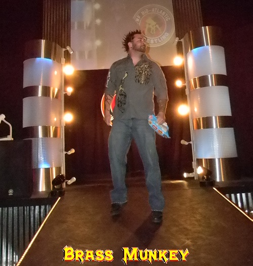 CWF Mid Atlantic Heavyweight Champion Brass Munkey enters the arena to join Rob "Boogie Woogie Man" McBride & Roy "Rage" Wilkins in six-man tag team action at PWS 5th Anniversary Weekend Kickoff at Burlington NC's Carolina Sports Arena [02.27.09]