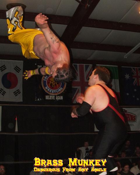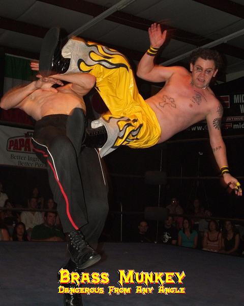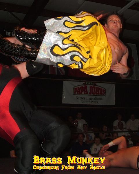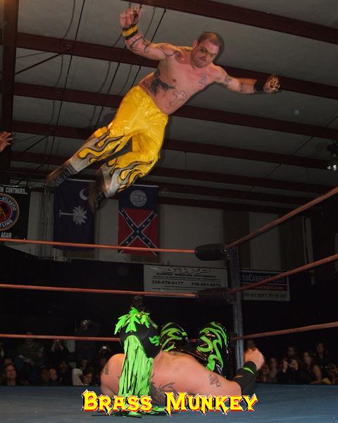 Brass Munkey, complete with blistered chest, sails toward the corner as advances over "Dangerous E" Corey Edsel in 2007 Johnny Weaver Invitational Tournament action in at Burlington NC's Carolina Sports Arena [08.11.07]