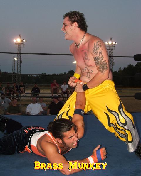 Brass Munkey ties up veteran Gemini Kid in tag team action at Burlington NC's Carolina Sports Arena [04.07.07]