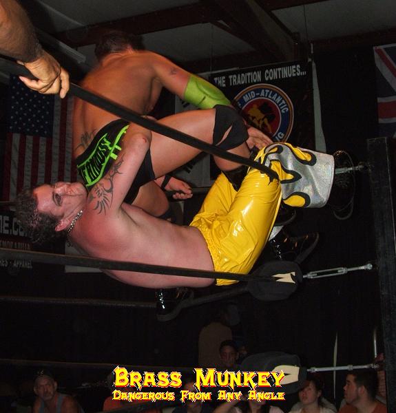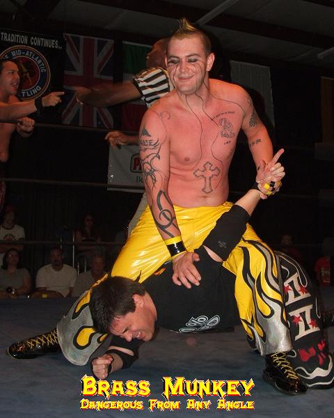 Brass Munkey takes a bite out of "Rock N Roll" Matty Dee in four-way action for a shot at the Mid Atlantic Television title at Burlington NC's Carolina Sports Arena [06.30.07]