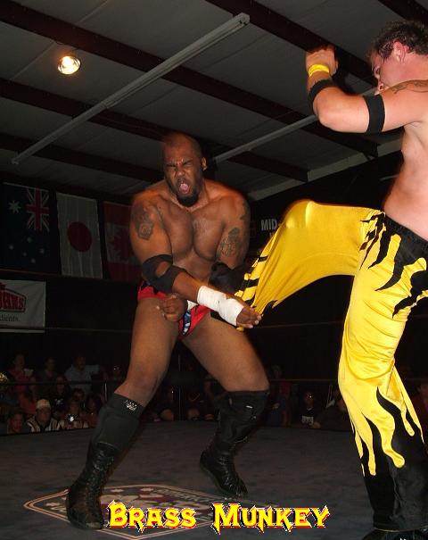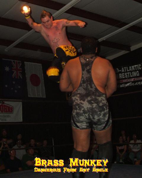 Brass Munkey seconds before he pounds big Ray Kandrack with his educated feet in tag team action at PWI BoogieJam 2k10 at Burlington NC's Mid Atlantic Sportatorium. [05.22.10]