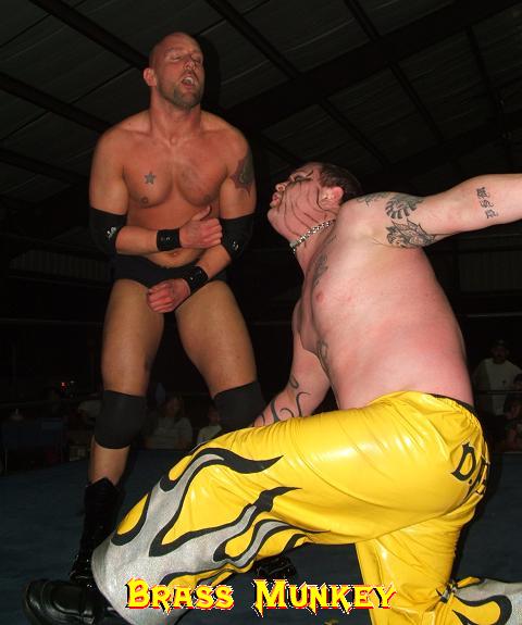 Brass Munkey stands over "Jersey" Nick Richards in tag team action at the Carolina Sports Arena in Burlington NC [05.17.08]