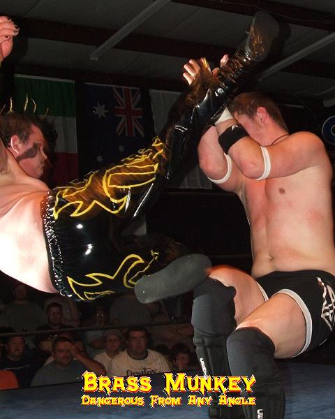 Brass Munkey stretches out "El Fuego" Jesse Ortega in singles action at CWF Mid Atlantic's WAR GAMES! at Fairchild Rec. Center in Burlington NC [02.24.07]