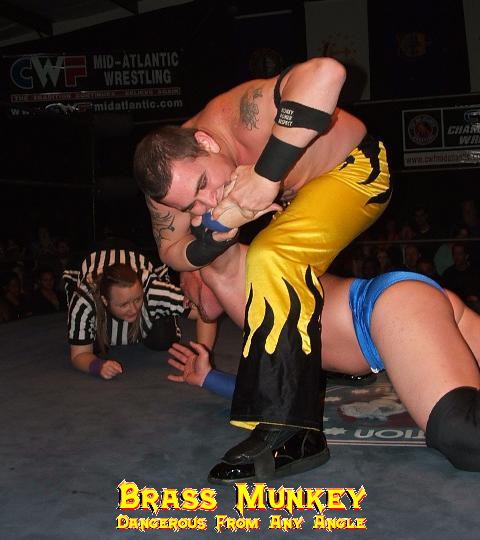 AWA Mid Atlantic Television Champion Brass Munkey takes a bite out of challenger "Mr. Elite" Jake Manning at CWF Mid Atlantic's Carolina Sports Arena [10.14.06]