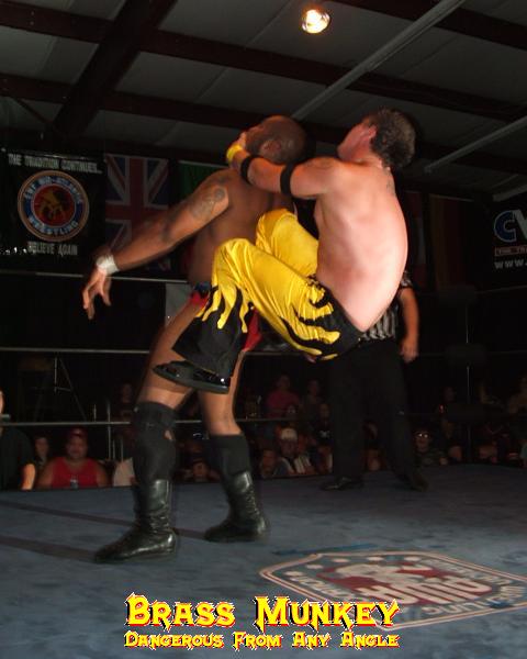 Brass Munkey wrenches "Infamous Icon" Joey Silvia off of the top ropes at Burlington NC's Carolina Sports Arena in 2007 Johnny Weaver Invitational Tournament action [08.25.07]