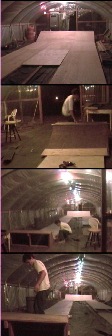 we started working on the floor and bank around noon on friday oct 17 ramzi came over to help us, and at one point he was swatting at a bee or somthing and let a skateboard fly. it hit the strand of lights and nocked all of them down, shattering most. that caused us a little bit of setback, but we got all the glass cleaned up, and finished up the floor. |