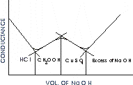 Procedure: 5 ml HCl (0.1 M); 5 ml CH3COOH (0.1 M) and 5 ml CuSO4 (0.1 M) are taken in a beaker and 85 ml of distilled water is added to it. The whole mixture is then titrated with 0.1 M NaOH conductometrically and the conductance readings are recorded.