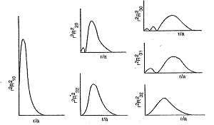 Let us now consider the probability of the electron being observed with the radial distance r lying between some given value r and (r+dr), irrespective of the direction from the nucleus (and so, irrespective of values of the angles q and f). We knew that the probability of the electron lying with r between r & (r+dr), q between q & (q+dq), and f between f & (f+df) is |y(r,q,f)|2 r2 sinq dq df dr = |R(r)|2 |Y(q,f)|2 r2 sinq dq df dr. So the probability that the electron lies with r between r & (r+dr), irrespective of the values of the angles q and f (or in other words within an annular region between two spheres with radius r and r+dr) is dpr = 0∫2p0∫p |R(r)|2 |Y(q,f)|2 r2 sinq dq df dr = |R(r)|2 r2 dr. 0∫2p0∫p |Y(q,f)|2 sinq dq df. As, we know, 0∫2p0∫p |Y(q,f)|2 sinq dq df always equals 1, so this probability dpr = |R(r)|2 r2 dr. However, as the radial wavefunction R(r) is always real (Table 2.1), |R(r)|2 further equals R2(r) or R2 (also denoted as Rnl2). Thus the probability dpr = r2 R2 dr = f(r) dr, where f(r) = r2 R2 (rhyme-like to remember, isn't it?) is called the radial distribution function (this name implying that the probability distribution along the radial distance r is given by this function). In contrast to the radial wavefunction Rnl(r), the radial distribution function r2 Rnl2(r) has zero value at r = 0 (obviously due to the r2 factor in it) even for the s-type wavefunctions, have higher values for larger values of r (due to the r2 factor), and is everywhere positive-valued (as Rnl(r) function remains squared here) -- check the r2 Rnl2(r) vs. r plots in Fig. 2.2.