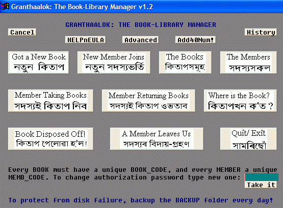 Granthaalok (meaning The Light of Books in most Indian languages) is a freeware (first introduced in Feb 2006) developed by Rituraj Kalita of Guwahati (India). It should be ideal for managing the book-lending and returning information of a small book-library, such as your personal (books & discs) collection, a neighborhood library or the mini-library in an academic department. It is kept very simple, as it is made to revolve around only the few basic processes of entry of new books, admission of new members, book-list viewing, member-list viewing, book-lending, book-returning, book-search, book-disposal and member-farewell, as is seen in its central working screen displayed below. The command buttons for these basic processes are kept bi-lingual, using both English & Assamese translations describing the processes. (In Granthaalok you may, surely, use the term book in a more general sense to include books, notes, manuscripts, CDs, DVDs etc.)