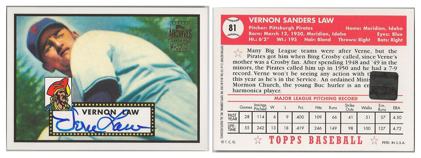 1960 Vernon Law - Pittsburgh Pirates - 2001 Topps Archives Autograph #TAA13