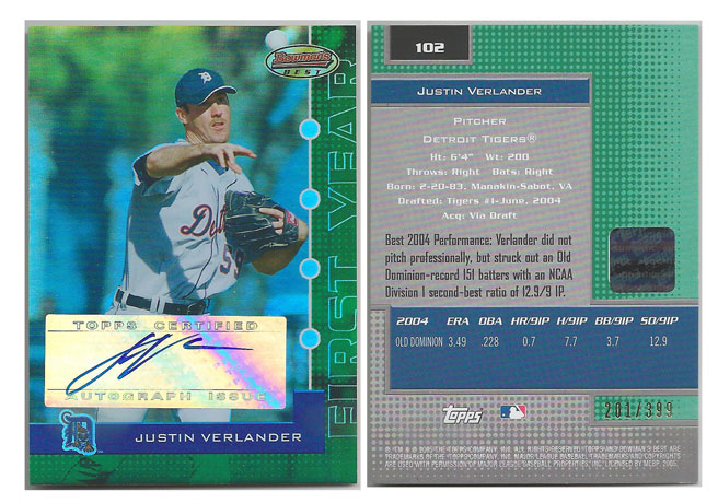 2011 AL - Justin Verlander - Detroit Tigers - 2005 Bowman's Best Green Rookie Autograph #'d 201/399