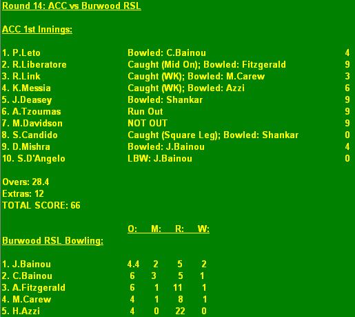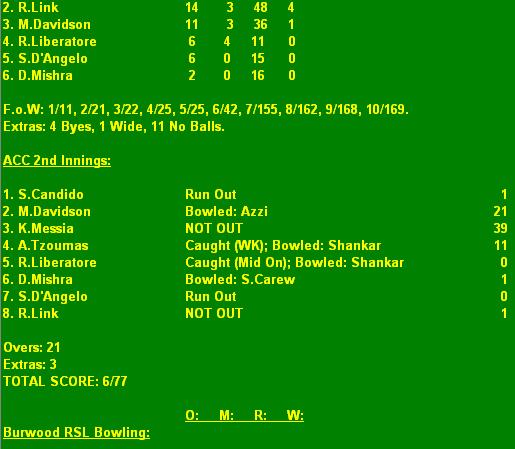 Result: Burwood RSL def. ACC 1st Innings.