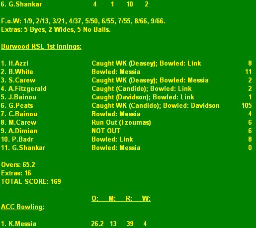 Burwood RSL: 169 (G.Peats 105) (K.Messia 4/39, R.Link 4/48).