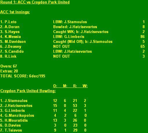 ACC: 6dec/195 (K.Messia 86, J.Deasey 65*) (J.Hatzisevastos 3/53)