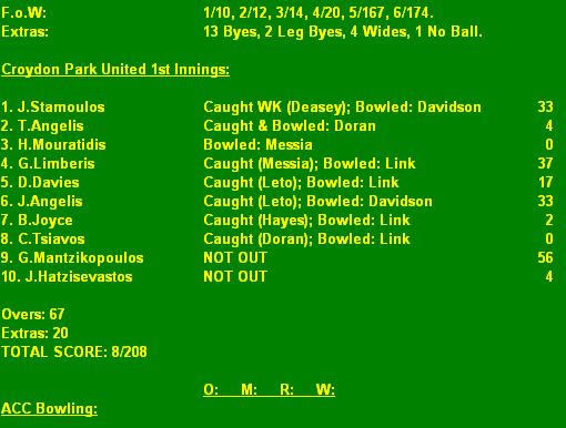 Croydon Park Utd: 8/208 (G.Mantzikopoulos 56*) (R.Link 4/74)
