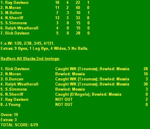 Redfern All Blacks: 161 (Ray Davison 50) (R.Link 4/34) & 6/79 (K.Messia 6/28)