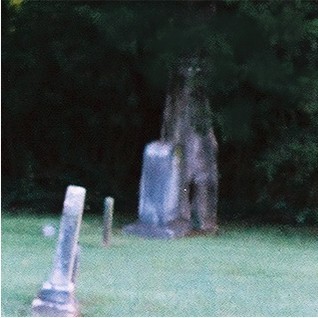 This is a very good 'ghost' photograph. It was taken using a chinon 35mm slr, 50mm lens, skylight lens filter, 400 asa film, and no flash. This anomaly appeared in the lower corner of the negative, and it is blown up quite a bit to be seen here. Other pictures were taken at the same time, but none revealed this image. The photo was of a tree in a graveyard. There were confirming emf readings at the time the photograph was taken.