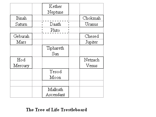 Most astrologers cast and use a horoscope, which is translated as ‘a view of time’ to depict planetary placements which serve to influence our daily activities. For example, the square horoscope was used extensively until the middle ages when it was replaced by the circular version which was more clearly representative of the orbital paths of the celestial bodies that were observed. Cabalistic astrologers tend to take a slightly different approach because they wish to observe the planets as they relate to each sephira in the Tree of Life. Therefore, the sign and house placement is written on the associated node of the trestleboard.