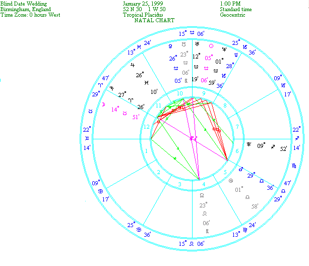 The most significant factor with regard to the wedding chart is that both Mars and the 6th/12th house cusps are posited in the 29th, or anaretic degree. ‘The Anaretic Degree’, written by Helen and Jim Garret, focused on the impact that the 29th degree had in the horoscope. In this work, it was noted that the 29th degree was found in all but one of almost 100 marriages during a research project that the couple conducted.