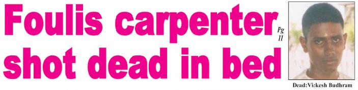 The incident occurred at about 23:00 hours and although most of the occupants of the house were at home, no one saw the killers apart from Budhram’s wife. Police in a press release stated that so far their investigations have revealed that Budhram, along with his reputed wife and other family members had retired to bed when she was aroused by the sound of a loud explosion in the bedroom. She observed two men running out of the room and upon checking found that Budhram had been shot to the right side of the neck. Investigators believe that the killers gained entry to the two flat house by removing a few louver panes from a window on the bottom flat. They then proceeded to the upper flat and went straight to Budhram’s room, which is situated at the front of the house, and shot him. Holding back tears, the dead man’s wife told this newspaper that she, her husband and their one-year-old baby were asleep when the blast from the weapon rudely awakened her. “I just hear a hard sound and I get up and start to holler. I see two persons run out de room. I hold me daughter and den I shake he (Budhram) and de blood start fuh spray,” Rambharose recalled. She said that her husband tried to speak to her but could only open his mouth in vain. The woman added that she called out to neighbours but no one came to her assistance. She told this newspaper that the men were dressed in black and she did not get a chance to see their faces since they were wearing masks. The couple have been living together as man and wife for two years and has another daughter; two-year-old Ramona, who was sleeping with her grandmother in another room at the time of the incident. Investigators said that they recovered a 7.62 shell and a warhead which is used in AK-47 rifles. But what is baffling them is how the men managed to enter and flee the house without family members noticing them, since according to the occupants of the house, they had secured the property before going to bed. Dhanmattie Budhram, the dead man’s mother, related that shortly before the shooting she was in the living room downstairs watching television with her granddaughter. She said that she secured the front door with two bolts and retired to a bedroom in the upper flat of the house. She had planned to return downstairs to await the arrival of her husband who was out at the time, but she dozed off. However, the sound of the gunshot awoke her. “All me hear was a noise and I hear me daughter-in- law hollering. I hear a running in the house and I thought that it was me son running upstairs fuh see wha happen,” Budhram said. The foot steps she heard were in fact those of the killers making good their escape. She said that her daughter-in-law called out to her telling her that Vikesh had been shot. The woman said that by that time her husband had arrived home and enquired what the screaming and hollering was about. “Me nah see none body,” the woman said. When she eventually went into her son’s room, she saw him lying on his bed and upon checking said she saw a huge hole in his neck with blood pouring from it. The woman said that the now dead man was her eldest son and the best of her four children. She described him as always friendly to everyone. The dead carpenter’s father Ganesh Budhram told this newspaper that upon arriving home he noticed the front door of the bottom flat open and heard screaming. Upon entering his son’s room in the upper flat he saw Rambharose hugging her husband’s lifeless body. “All me see he get a hole in he neck and dem ah cry,” the elder Budhram told Kaieteur News. He too said he did not see the killers. Police believe that after killing Budhram, the gunmen fled west into the neighbouring village of Dazelle Housing Scheme, Paradise. They are trying to establish a motive for the killing, since Budhram was described by everyone as a hardworking, peace-loving individual who had no known problems with anyone. Foulis housewife beaten by bandits Government-should-resign Kumar Singh shot dead -AK-47 Foulis man was killed trying to drive away Francis Parmanand Singh was shot dead |