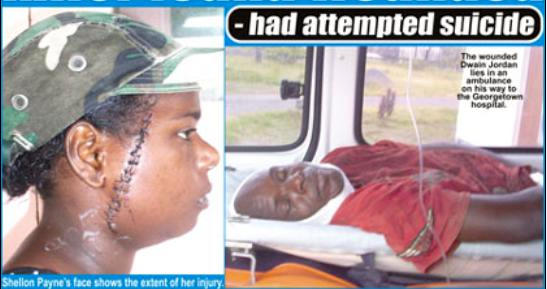 The 34-year-old Den Amstel, West Coast Demerara carpenter who hacked his wife to death last Thursday night is now a patient at the Georgetown Public Hospital after failing in his attempt to take his own life yesterday. Dwain Jordan was discovered in a clump of bushes in an empty plot of land in the village at around 15:45 hours yesterday, bleeding profusely from several gaping wounds about his body. Eyewitnesses said that one of his wounds was so huge that his intestines were protruding. There was also a deep cut at the back of one of his ankles. Neighbours said that they learnt that the badly wounded Jordan was lying in the grass only when he called out for help. Jordan went into hiding last Thursday night shortly after killing his reputed wife, Claudine Rampersaud, 30, and seriously wounding her sister, Shellon Payne, and Payne's boyfriend, Ryan Lewis. The neighbours could not say for how long Jordan was in the empty lot, but they were almost certain that he did not seek refuge there on the night of the chopping spree. Police had launched a manhunt for Jordan, and there were even rumours that he had been spotted on Friday. Kaieteur News understands that Jordan had contacted relatives and had informed them that he would kill himself rather than face the consequences of his actions. One neighbour told Kaieteur News yesterday that she saw Jordan lying in the bush with his stomach protruding. “He was trying to get help. He couldn't walk, maybe he was crawling. Somebody heard him groaning and they called the police,” the neighbour said. The police collected the badly injured man and took him to the West Demerara Regional Hospital, from where he was transferred to the Georgetown Public Hospital. A senior police official told this newspaper that some of the wounds on Jordan's body were inflicted before yesterday. He suggested that Jordan might have sustained some of the wounds during the scuffle he had with the persons he attacked on Thursday night. However, relatives of the dead woman refuted this, claiming that it was only Jordan who was armed. “If he de get wound then, you would'a see bloodstains leading from the house,” Shauda Payne told this newspaper. Jordan's father, Clifton Jordan, said that he did not know that his son was lying wounded in the empty lot which is situated next to his. “People tell me that my son was over there, but I did not go. A woman pass and ask me why I ain't going and see my son, but I didn't even answer she. The police come and that is when I went over,” Clifton Jordan said. He recalled that his son had visited him on Wednesday morning to repair the roof of his toilet. “He looked worried, like he face swell, but I didn't ask he nothing. I don't mingle in people affairs,” the wounded man's father told Kaieteur News. He said that he realised something was wrong between his son and his reputed wife when she stopped greeting him whenever they passed each other about three months ago. Jordan said that he learnt that when his son had complained to his reputed wife's parents about his suspicions of her outside affair, he did not get a favourable response. Over at the home of the dead woman's relatives, a number of villagers who had gathered there expressed relief that Jordan is now in custody, none moreso that Shellon Payne, who up to yesterday was still seeking treatment for a gaping wound on her face. They were, however, peeved that Jordan showed no remorse when they looked into his face. “He smiling at me but he ain't saying nothing. He call out fuh he cousin. I de want he fuh punish before he dead,” Shauda Payne recalled. Another sister, Sharmaine, told Kaieteur News that when she arrived at the empty lot, Jordan was lying in the grass with handcuffs on. The dead woman's relatives described the relationship between the couple as a very abusive one. They could not say why Claudine Rampersaud did not report the abuse despite the fact that she was a member of the Guyana Police Force. According to Shauda Payne, Jordan had previously walked out on her sister when their first child was born, and had married another woman in Essequibo. “He come back and say dat de woman wukkin' obeah pon he and he de sick, sick. Claudine tek he and carry he by she uncle in Parika and nurse he back to health, and then mek three more children fuh he,” Payne said. She explained that on another occasion, the couple had separated and Jordan had begged Rampersaud to make up, promising to marry her. Payne said that her sister had told her Jordan had attempted to carry her in the yard where she was murdered on several other occasions. On Thursday night, Rampersaud had attended an insurance meeting, which Jordan had knowledge of, and had returned home a little later than usual. That was when she was attacked and chopped to death. Her brother, Troy Rampersaud, said that he had seen Jordan sharpening a knife earlier that afternoon, but he did not think that Jordan was preparing to kill his sister. Last Thursday's incident was a shocking reminder of a similar incident in the village four years ago, when a man hammered his wife to death. Meanwhile, police say they will await word on Jordan's condition before instituting charges. He remains under close watch at the Georgetown Public Hospital. Sunday 06-17-2007 |