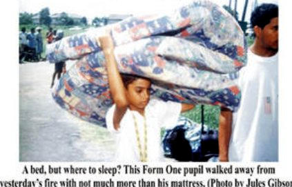 Boys dash into burning building Sixteen-year-old, Aumesh Anantram, a fourth form student, said he was heading to the dormitory after making a purchase at the canteen when he saw the building on fire. "I turned around and saw other students running towards the building and I ran also." The schoolboy of Bath Settlement, West Coast Berbice recounted that he forced his way through the doors, while thick smoke covered his face. "But I persevered until I got into my dorm, grabbed my bag and left." Anantram was among 20 others who managed to retrieve their belongings but others like, Dhaniram Seepersaud said they tried to enter the building in a bid to save their belongings, but were overcome by the smoke. Seepersaud told this newspaper he ran upstairs, but had to rush out because of the intense heat and smoke. He said he lost several books, sneakers and clothes. Wellington said a quick call was made to Georgetown alerting the Guyana Fire Service, while another was made to the Guyana Sugar Corporation's (Guysuco) Enmore Estate. He said in the meantime, some of the maintenance staff along with other workers formed a bucket brigade and tried to put out the fire. Their efforts were in vain as the fire assisted by high winds ripped through the building within half an hour. When the Guysuco tenders arrived, the fire fighters managed to contain the fire from spreading to the other buildings by dousing them with water. However, this desperate move could cost the school, as the hundreds of books in the administration building were soaked as well as those in the school library. Several pieces of furniture were soiled, as well as numerous files, records and other important documents.