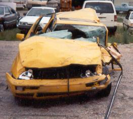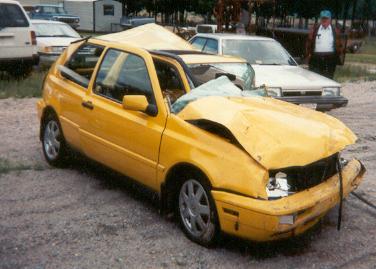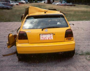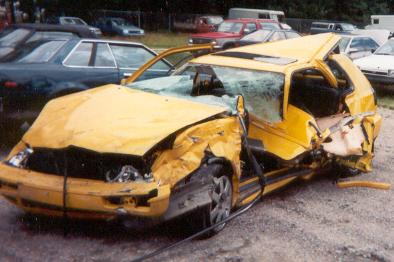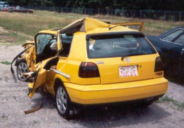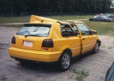 This (obviously) was the car I was in a wreck with. It's a 1997 VW golf GTI driver's edetion. It had the vr6 attatched to a 5 speed. and had a very nice black leather interior with red stitching and some aluminum trim. I had this car for two days, and on the way to my friends house, some ford taurus slid around a corner and kinda reverse t-boned me. As you can see it was completely totalled. All that isn't from the wreck though, the fire department had to cut the roof and the drivers door to get me out. I didn't like that too much but i had no other alternative I had a broken left leg and arm and a few cracked ribs. And I was the least injured, but the other two in the ford weren't wearing their seatbelts. I really liked this car, but I should be able to get another one when im done with their insurance company...