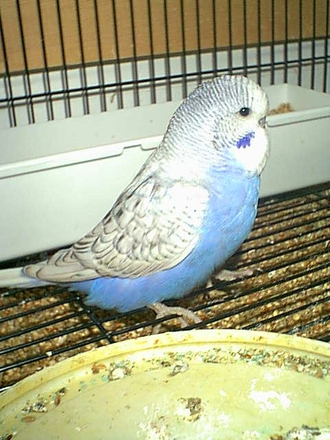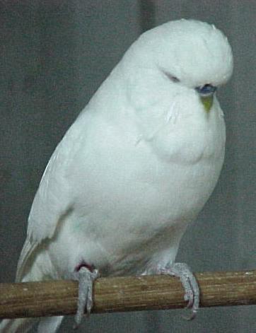 When a bird has two Spangle genes (double factor) the bird no longer produces melanin and appears as either completely white (blue series) or completely yellow (green series). The bird below is a double factor spangle in the blue series.