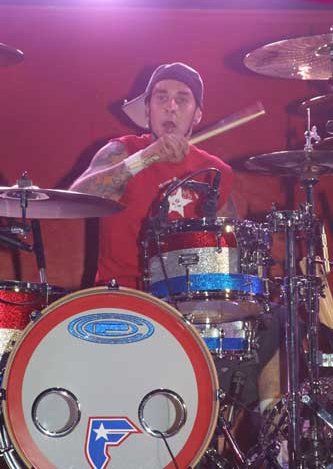 In Concert: Travis plays Orange County Drum Percussion drums, Zildjian Z Cymbals and 5B sticks, Remo Coated Emperor drum heads.