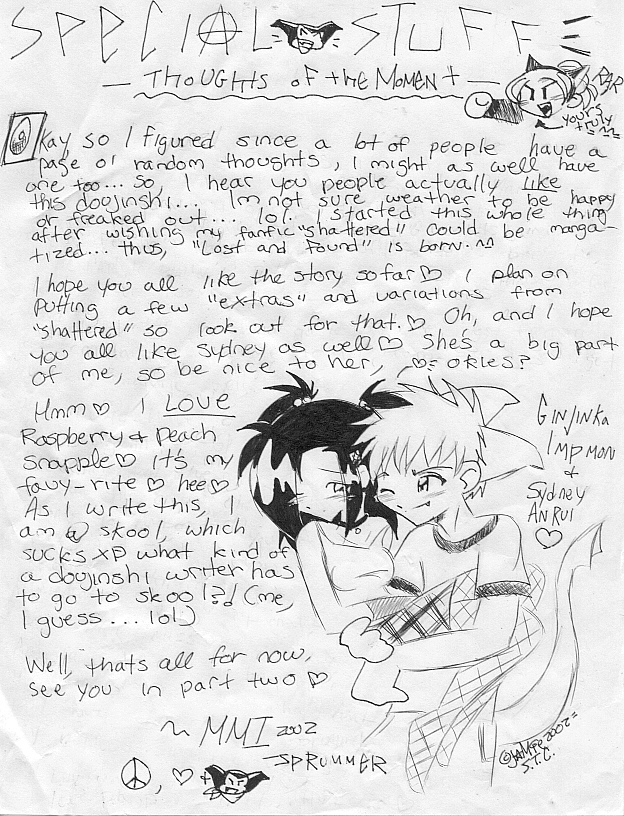 I also hope that you will all enjoy it, it is crazy fun to write and draw =D You can expect it to be @ LEAST 20 pages long- perhaps more =3 I am trying to make it as doujinshi-like as i possibly can- so bear with me- the lines are NOT all straight, and there is white out marks everywhere... but TRY and look past that ok? ^^; its NOT perfect, and wouldnt be in a MILLION years ^^; lol