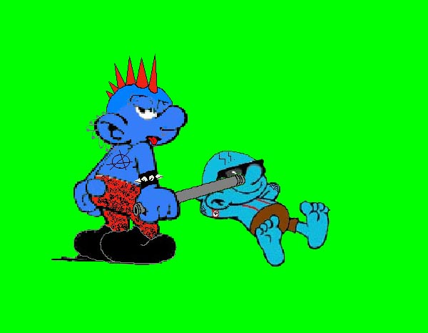 smurfpunk walks up to naziskinheadpunk and say's:"Oi, what the fuck do you think youre doing here." naziskinheadsmurf answers: "i'm lying in the sun, you dirtyscumbag, piss off."