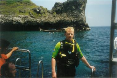 I bumped into a Brit in a beach bar, and he convinced me that I should try scuba diving. I had no idea that I would try this sport, but that very night I signed up. The next day would turn out to be one of the best days of my life. I did what is called a recreational dive. Very basic theory, then in the water. And I don't mean waist-level water. My first dive the instructor took me down to my maximum depth, 12meters, about 40 feet. And we didn't come up to discuss anything; I was down there for 50 minutes my first-ever F-ing dive!! He hangs onto you for the first little while, but then lets you go. The second dive, after a lunch and waiting period, he leaves you alone to enjoy yourself, as long as you don't go too low or high, and stay at instructor's depth.