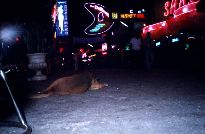 This picture is a little pun. It's a Soi Dog sleeping amidst the nightlife in Soi Cowboy.