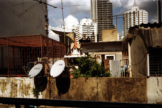 This is a view from a Skytrain station, around 50 feet in the air. So we're looking across at the top apartment of what is probably a 6 floor building. I like the picture because it shows the different faces of Bangkok side by side: laundry out to dry in the air, a spirit house perched on a perch near 2 satellite dishes, a lot of antennae, and skyscrapers dominating the skyline.