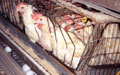 After the sows give birth and nurse their young for two to three weeks, the piglets are taken away to be fattened, and the sows are re-impregnated. An article in Successful Farming explains, "Any sow that is not gestating, lactating or within seven days post weaning is non-active," and hog factories strive to keep their sows '100 % active' in order to maximize profits. When the sow is no longer deemed a productive breeder, she is sent to slaughter. Prior to being hung upside down by their back legs and bled to death at the slaughterhouse, pigs are supposed to be 'stunned' and rendered unconscious, in accordance with the federal Humane Slaughter Act. However, stunning at slaughterhouses is terribly imprecise, and often conscious animals are hung upside down, kicking and struggling, while a slaughterhouse worker tries to 'stick' them in the neck with a knife. If the worker is unsuccessful, the pig will be carried to the next station on the slaughterhouse assembly line — the scalding tank — where he/she will be boiled, alive and fully conscious.