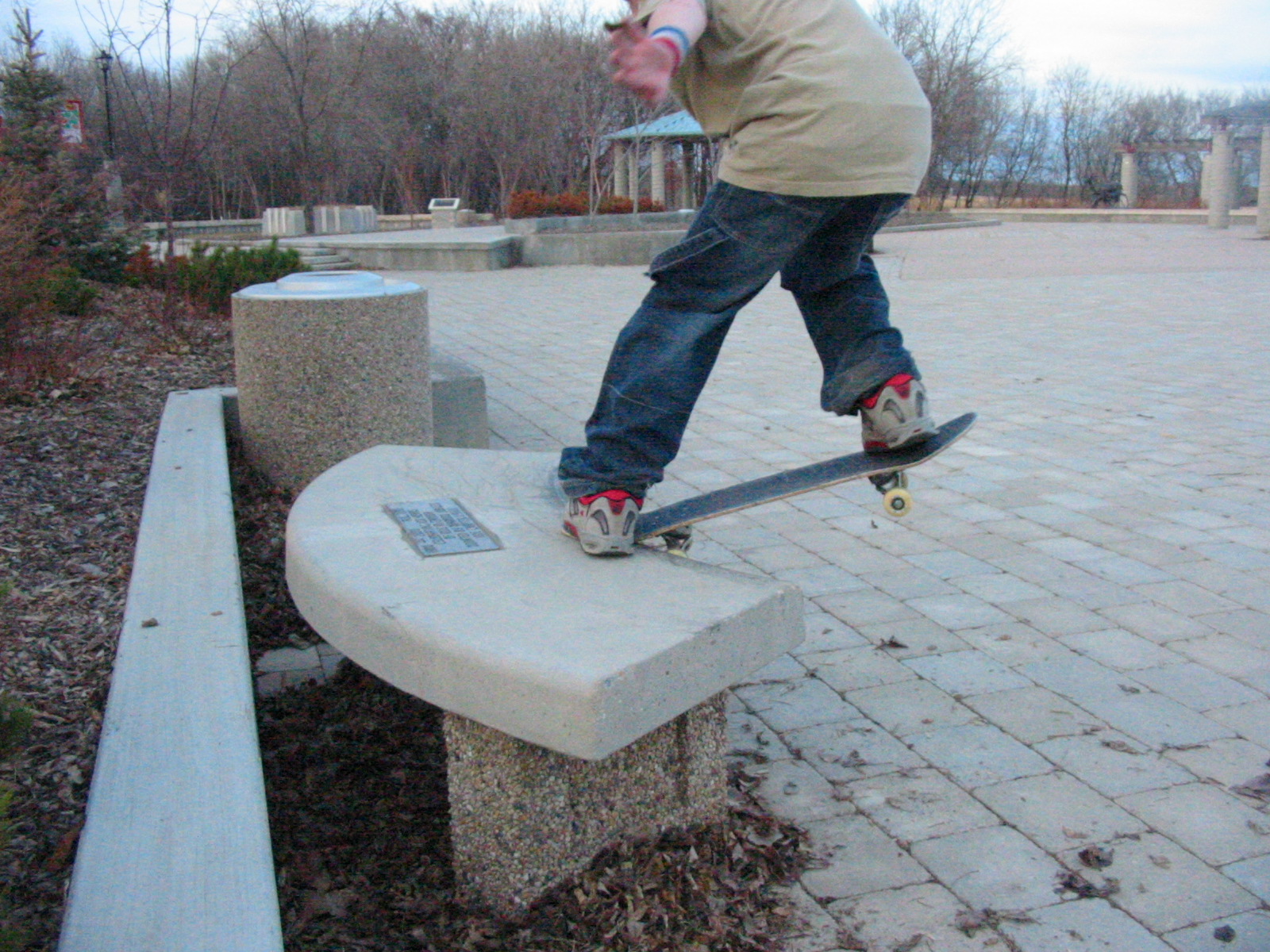 Duey makes his first appearance on the StickMan site with a noseslide on the curved bench at Botanical Gardens, followed by a lipslide on the minipipe by Darrin.